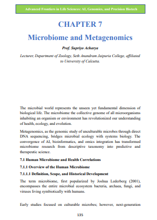 | Feb, 2026 | Advanced Frontier in Life Sciences: AI, Genomic and Precision Biotech-01 | Microbiome and Metagenomics | SCICRAFTHUB Publications | 978-81-996857-0-3 | Document |