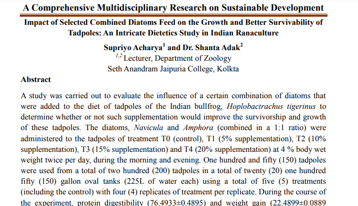 | Feb, 2026 | A Comprehensive Multidisciplinary Research on Sustainable Development-02 | Impact of Selected Combined Diatoms Feed on the Growth and Better Survivability of Tadpoles: An Intricate Dietetics Study in Indian Ranaculture | Multi Spectrum Publications | 978-81-999601-9-0 | Document |