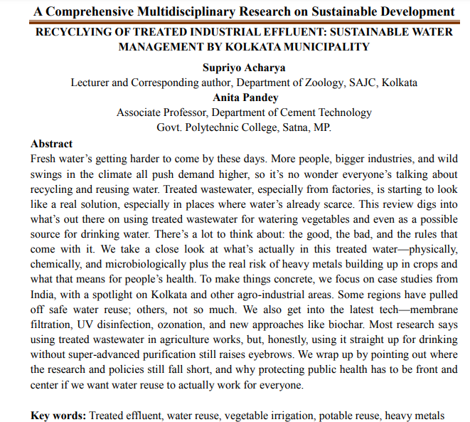 | Feb, 2026 | A Comprehensive Multidisciplinary Research on Sustainable Development- 04 | Recyclying of Treated Industrial Effluent: Sustainable Water Management by Kolkata Municipality | Multi Spectrum Publications | 978-81-999601-9-0 | Document |