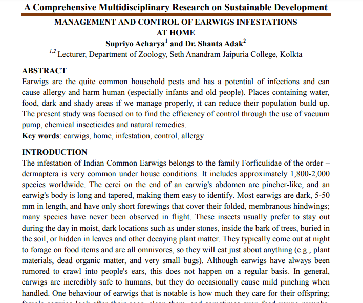 | Feb, 2026 | A Comprehensive Multidisciplinary Research on Sustainable Development- 05 | Management and Control of Earwigs Infestations at Home | Multi Spectrum Publications | 978-81-999601-9-0 | Document |