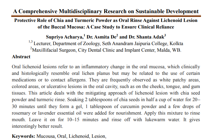 | Feb, 2026 | A Comprehensive Multidisciplinary Research on Sustainable Development-06 | Protective Role of Chia and Turmeric Powder as Oral Rinse Against Lichenoid Lesion of the Buccal Mucosa: A Case Study to Ensure Clinical Reliance | Multi Spectrum Publications | 978-81-999601-9-0 | Document |