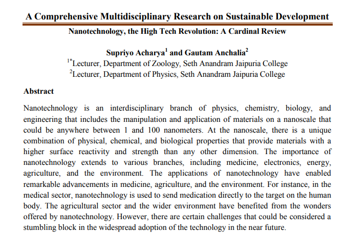 | Feb, 2026 | A Comprehensive Multidisciplinary Research on Sustainable Development-07 | Nanotechnology, the High Tech Revolution: A Cardinal Review | Multi Spectrum Publications | 978-81-999601-9-0 | Document |