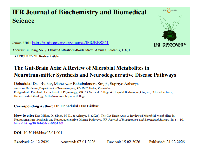 | Feb, 2026 | The Gut-Brain Axis: A Review of Microbial Metabolites in Neurotransmitter Synthesis and Neurodegenerative Disease Pathways | IFR Journal of Biochemistry and Biomedical Science | 2 | Supriyo Acharya and others | None | 2022 | Yes | 2022 | 2.2 | Document | ||