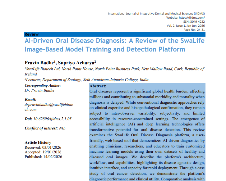 | Feb, 2026 | AI- Driven Oral Disease Diagnosis: A Review of Swalife Image-Based Model Training and Detection Platform | International Journal of Health Sciences and Engineering | 2 | Supriyo Acharya and other | 3049-3811 | None | 2022 | Yes | 2022 | 1.1 | Document | |