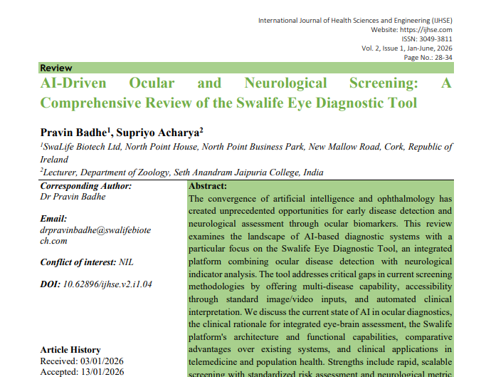 | Feb, 2026 | AI-Driven Ocular and Neurological Screening: A Comprehensive Review of the Swalife Eye Diagnostic Tool | International Journal of Health Sciences and Engineering | 2 | Supriyo Acharya and other | 3049-3811 | None | 2022 | Yes | 2022 | 1.1 | Document | |