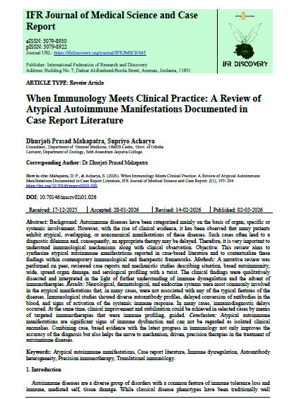 | Mar, 2026 | When Immunology Meets Clinical Practice: A Review of Atypical Autoimmune Manifestations Documented in Case Report Literature | IFR Journal of Medical Science and Case Report | 2 | Supriyo Acharya and other | 3079-8930 | None | 2022 | Yes | 2022 | 0.9 | Document | |