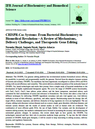 | Mar, 2026 | CRISPR-Cas Systems: From Bacterial Biochemistry to Biomedical Revolution—A Review of Mechanisms, Delivery Challenges, and Therapeutic Gene Editing | IFR Journal of Biochemistry and Biomedical Science | 2 | Supriyo Acharya and other | None | 2022 | Yes | 2022 | 0.2 | Document | ||