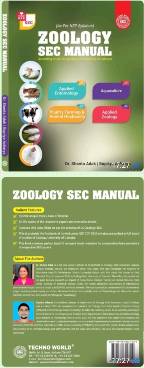 | Feb, 2025 | ZOOLOGY SEC MANUAL (AS PER NEP SYLLABUS) (ACCORDING TO THE UG SYLLABUS OF UNIVERSITY OF CALCUTTA) SEC 1, 2, 3 and SEC G. (University of Calcutta) Text Book of UG Zoology | TECHNO WORLD PUBLICATION | 978-93-89314-12-0 | Document |