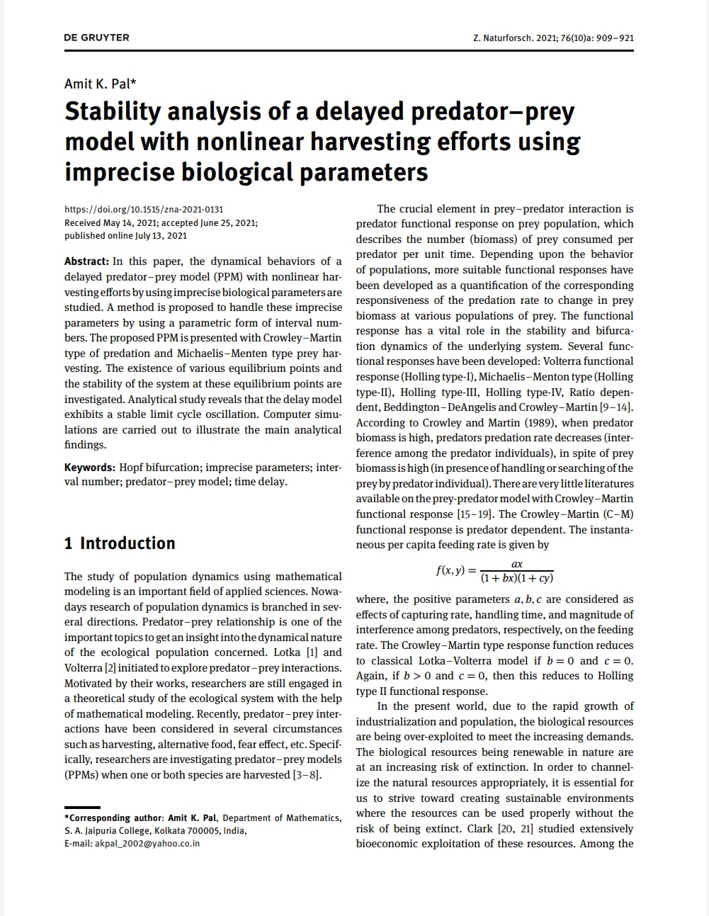 Stability analysis of a delayed predator-prey model with non-linear harvesting efforts using imprecise biological parameters |