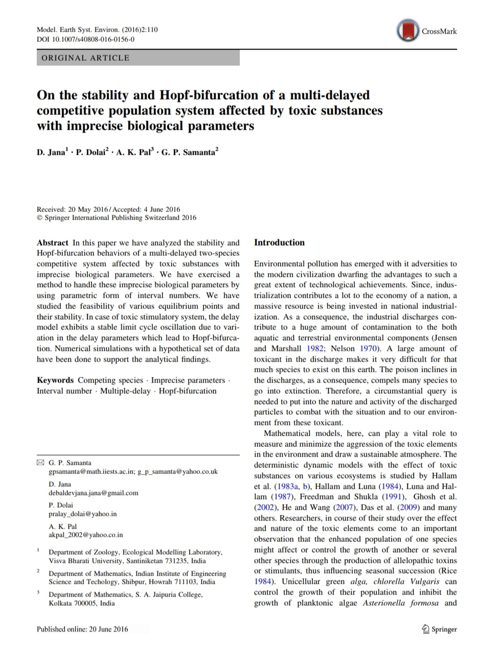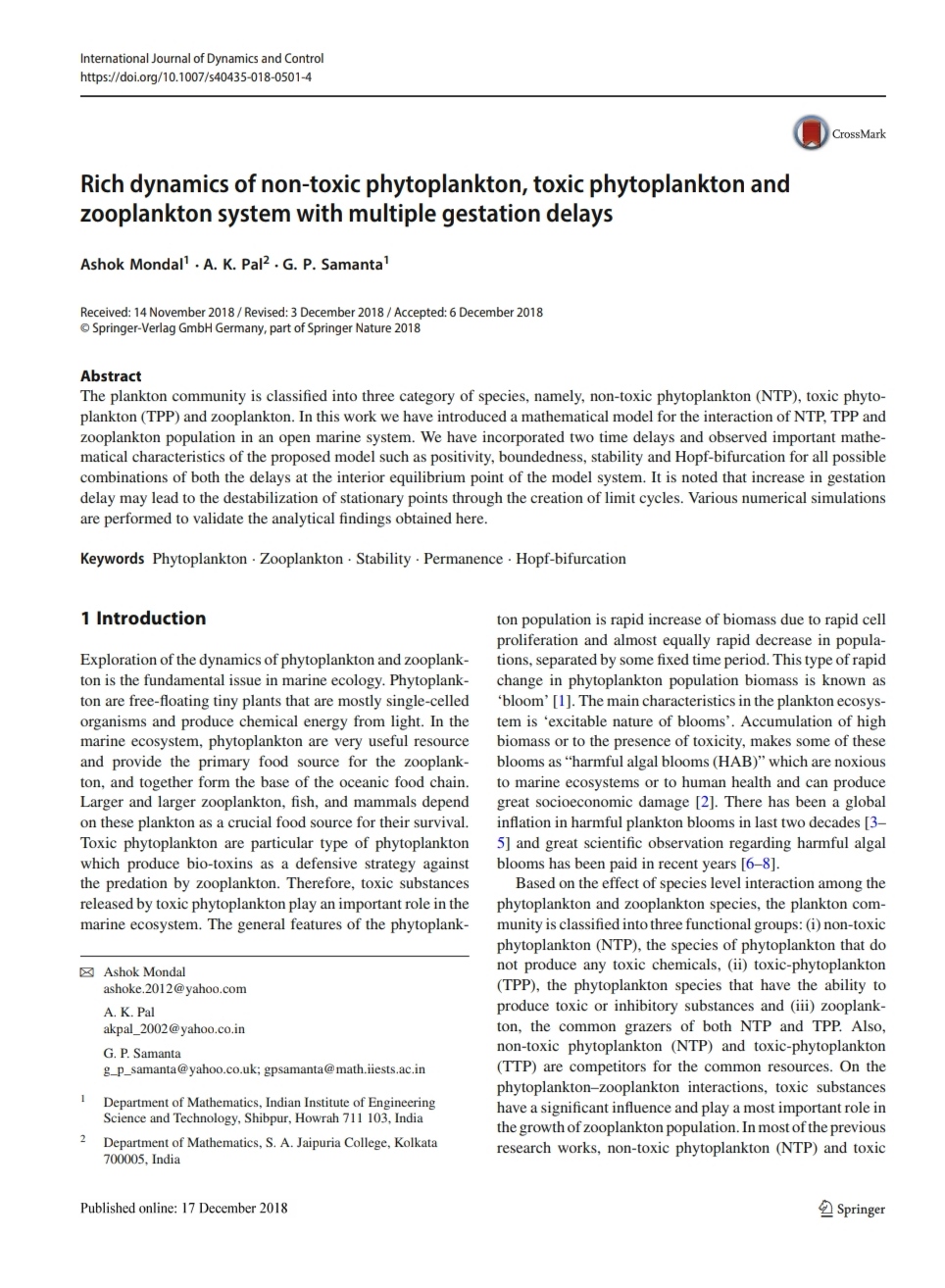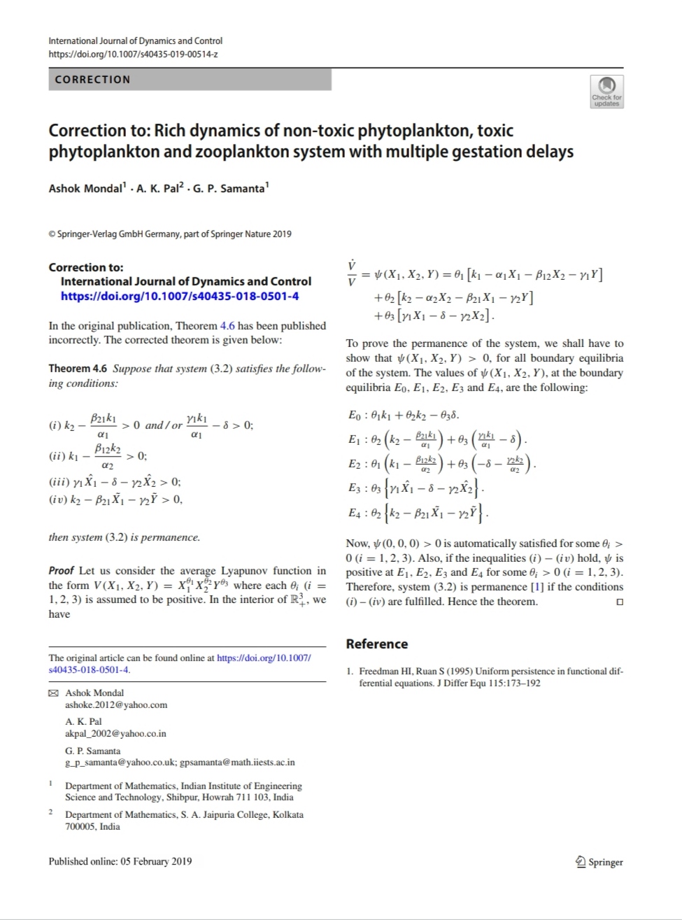 Correction to : Rich dynamics of non-toxic phytoplankton, toxic phytoplankton and zooplankton system with multiple gestation delays, , . |