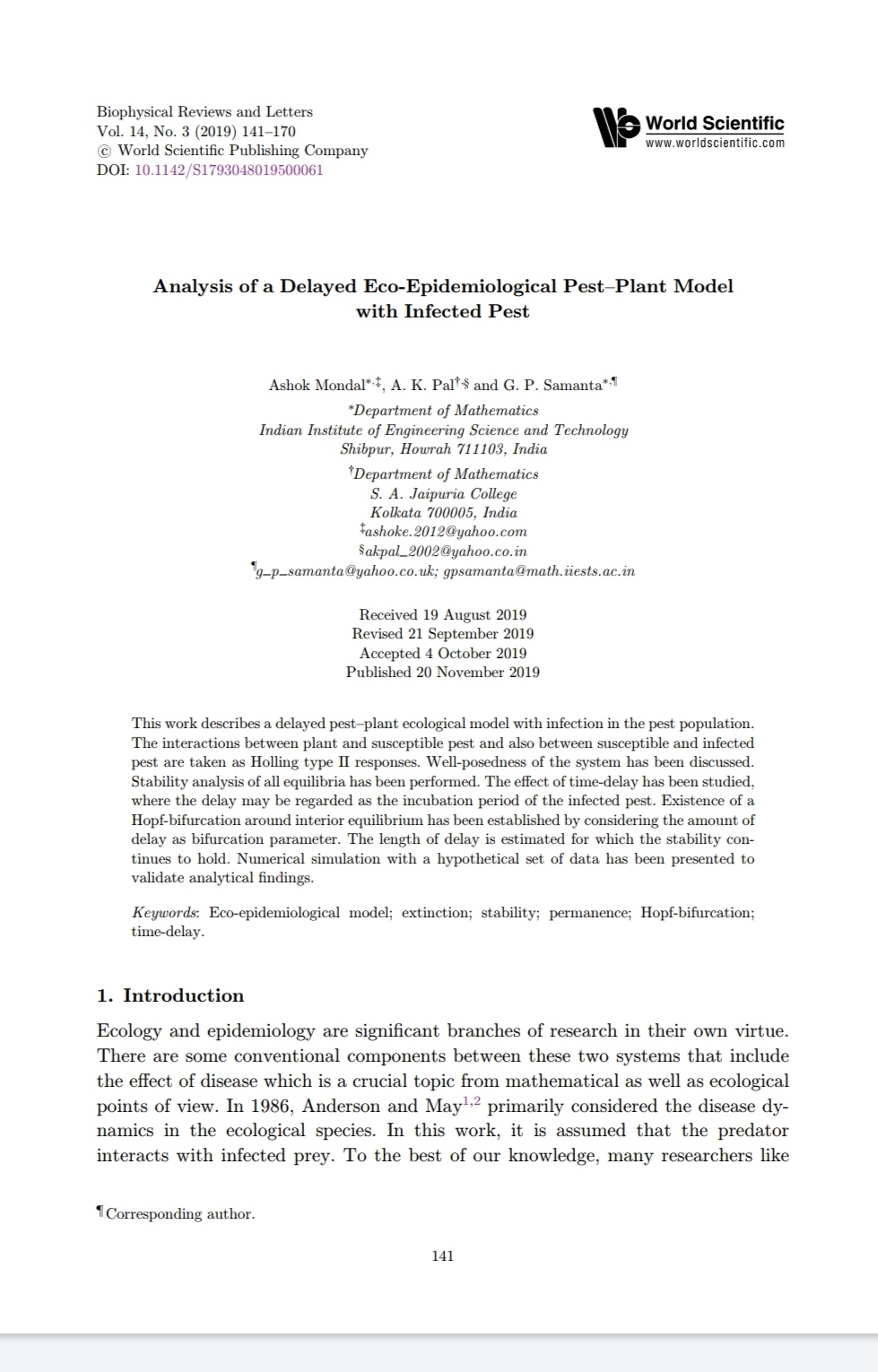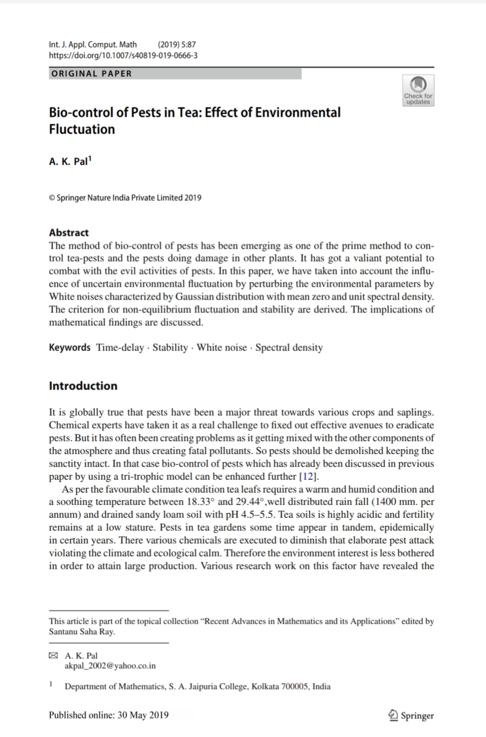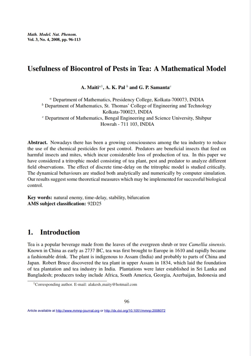 Usefulness of Bio-control of Pests in Tea: A Mathematical Model, |