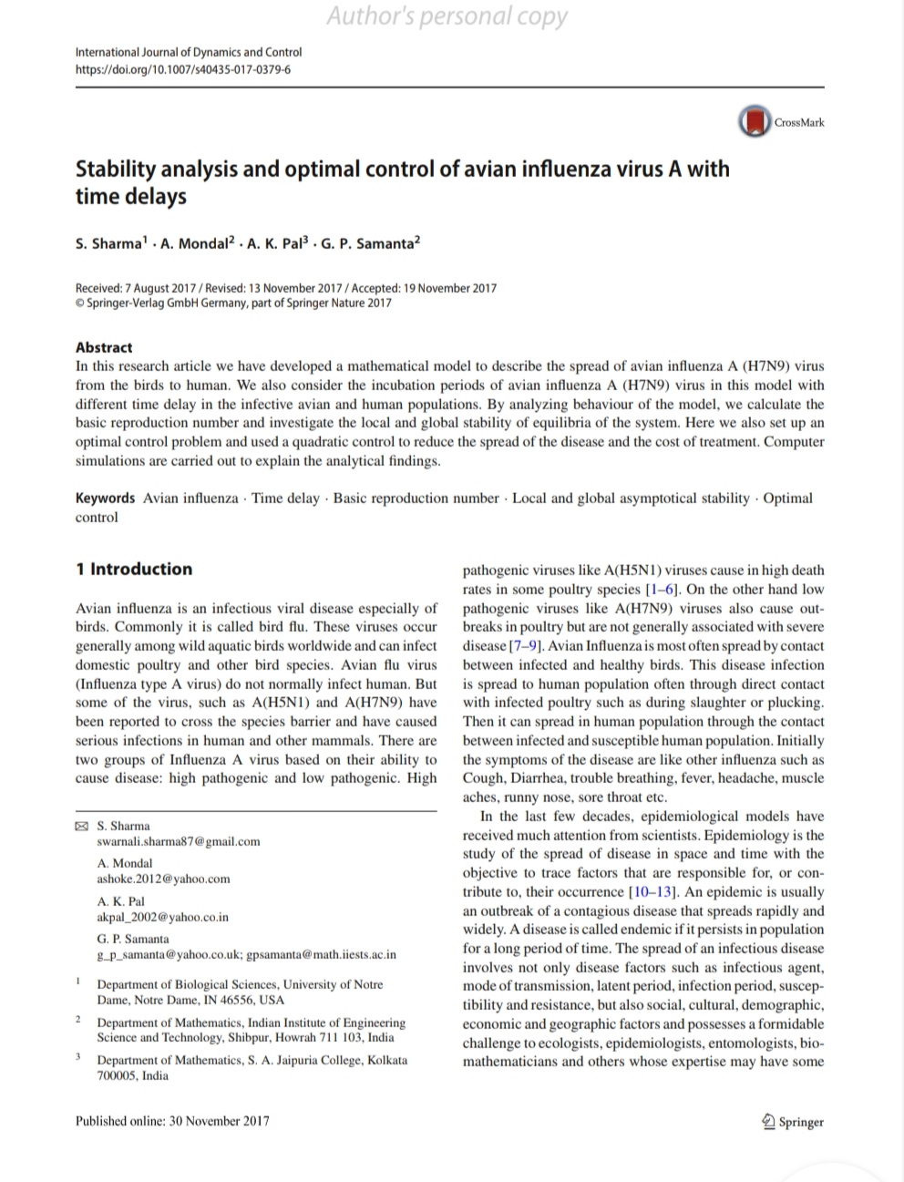 Stability Analysis and Optimal Control of Avian Influenza virus A with time delays, , , |