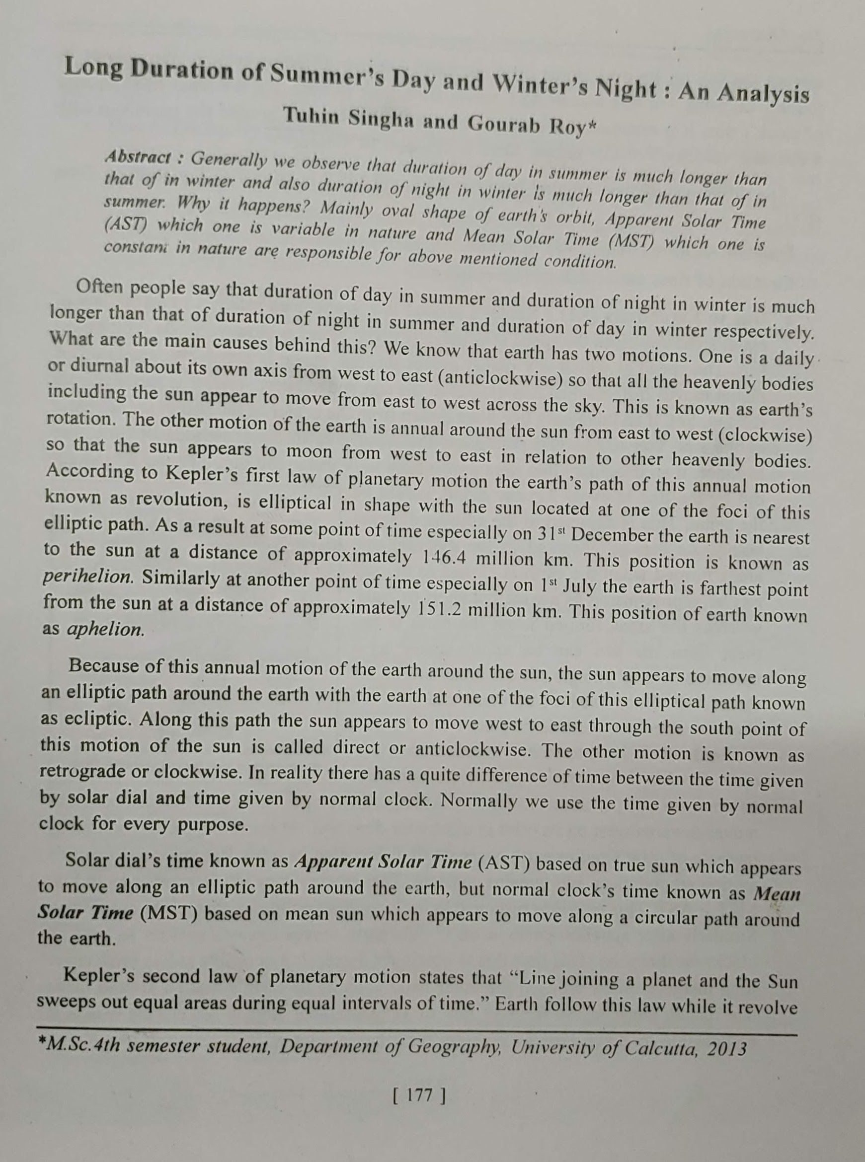 | Mar, 2013 | "Long duration of summer's day and winter's night: An analysis" | The Observer | 51 | Gourab Roy and Tuhin Singha | 2230-9535 | No | Celestial Motion | Document | ||||