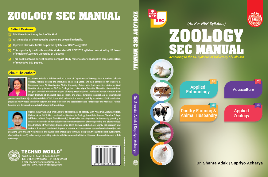 | Sep, 2025 | Text Book of UG Zoology SEC 1, 2, 3 and SEC G. (University of Calcutta) | Techno World Publication | 978-93-89314-12-0 | Document |