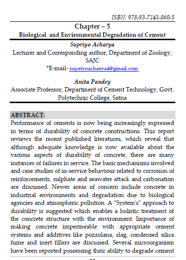 | Aug, 2025 | Recent Advancement in Green Chemistry | Biological and Environmental Degradation of Cement | Chyren Publication | 978-93- 7143-860-5 | Document |