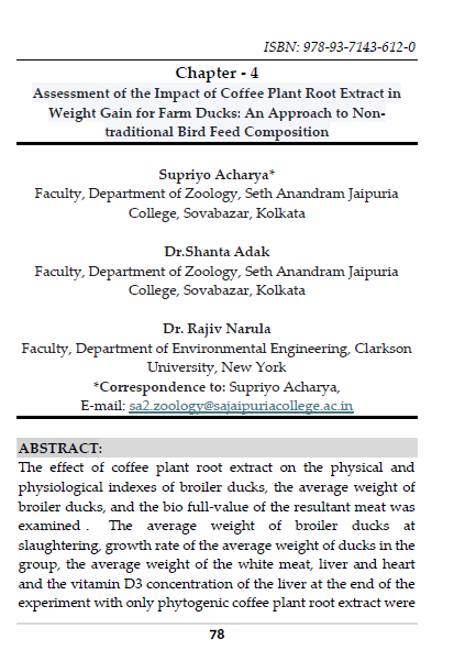 | Sep, 2025 | Integrated Perspectives on Life Sciences: Health, Agriculture, Nursing and Pharmacy | Assessment of the Impact of Coffee Plant Root Extract in Weight Gain for Farm Ducks: An Approach to Non-traditional Bird Feed Composition | Chyren Publications | 978-93-7143-612-0 | Document |