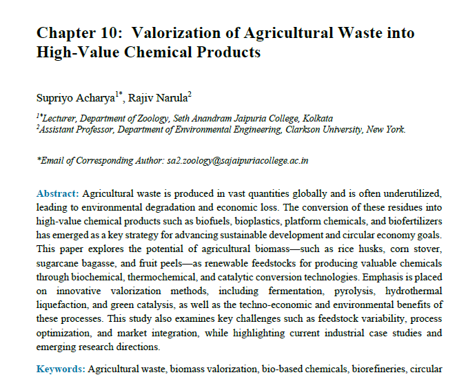 | May, 2025 | Green Chemistry, Nanotechnology and Sustainable Materials: Approaches for Achieving Sustainable Development Goals. | Valorization of Agricultural Waste into High Value Chemical Products | Deep Science | 978-93-7185-014-8 | Document |