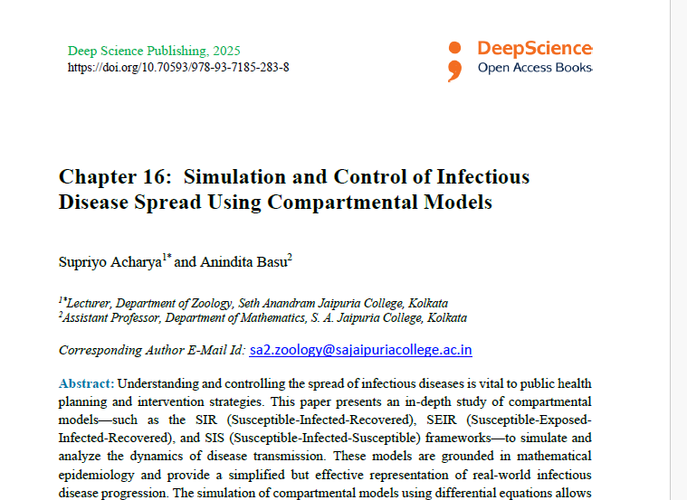 | Sep, 2025 | Applied Mathematics in Integrative Research: Quantitative and Computational Approaches. | Simulation and Control of Infectious Disease Spread Using Compartment Models. | Deep Science | 978-93-7185-949-3 | Document |