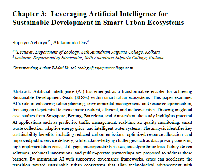 | Aug, 2025 | Technology, Law, and Management for Smart Societies, Artificial Intelligence, Digital Transformation, and Governance Perspectives-01 | Leveraging Artificial Intelligence for Sustainable Development in Smart Urban Ecosystems | Deep Science | 978-93-7185-368-2 | Document |