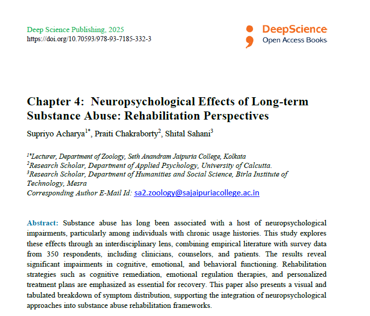 | Aug, 2025 | Technology, Law, and Management for Smart Societies, Artificial Intelligence, Digital Transformation, and Governance Perspectives-02 | Neuropsychological Effects of Long-term Substance Abuse: Rehabilitation Perspectives | Deep Science | 978-93-7185-368-2 | Document |