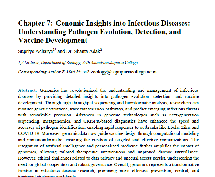 | Sep, 2025 | Frontiers in Genomics and Molecular Biology: Unlocking the Code of Life for Health and Agriculture | Genomics Insight into Infectious Diseases: Pathogen Evolution, Detection and Vaccine Development. | Deep Science | 978-93-7185-927-1 | Document |