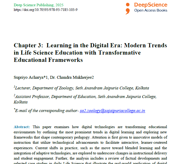 | Oct, 2025 | Transforming Education in the Digital Era: Innovations, Equities and Global Perspectives | Learning in the Digital Era: Modern Trends in Life Science Education with Transformative Educational Frameworks | Deep Science | 978-93-7185-826-7 | Document |