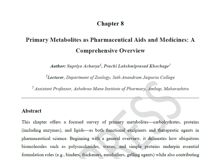 | Jul, 2025 | Textbook of Pharmacognosy and Phytochemistry I | Primary Metabolites of Carbohydrates, Protein and Enzymes. | Swalife Biotech Publication | 978-93-49682-54-2 | Document |