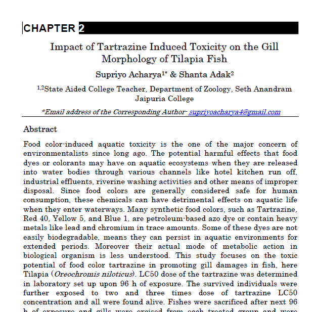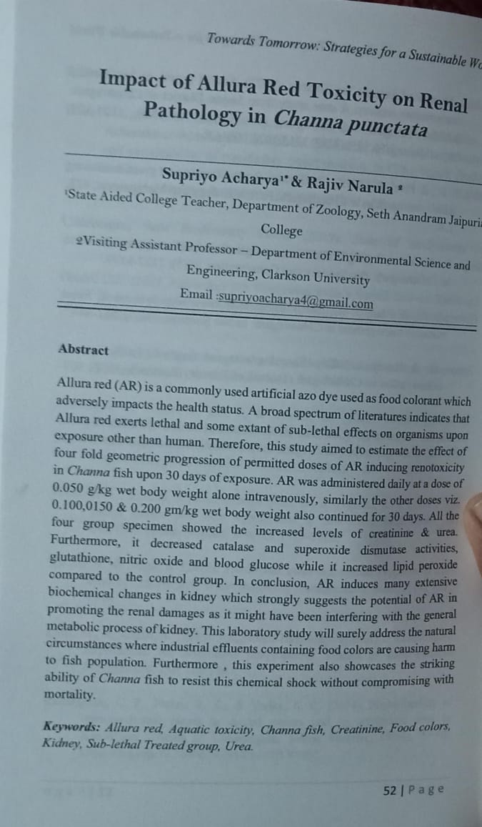 | Jul, 2025 | Towards Tomorrow: Strategies for a Sustainable World. | Impact of Allura Red Toxicity on Renal Pathology in Channa punctata | Notion Press | 979-890023068-9 | Document |