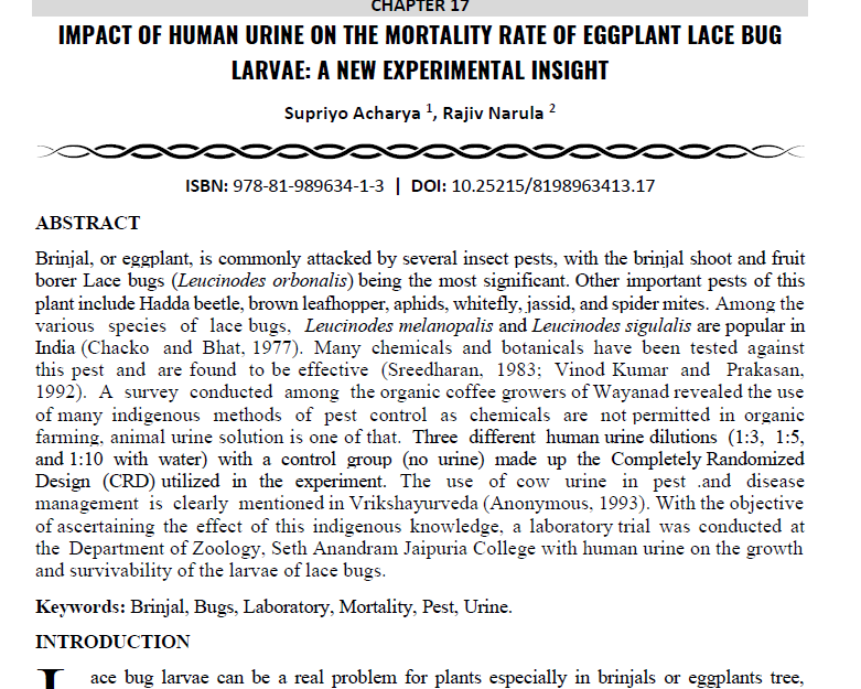 | Aug, 2025 | Global Dimensions of Multidisciplinary Research-01 | Impact of Human Urine on the Mortality Rate of Eggplant Lace Bug Larvae: A New Experimental Insight. | Innovative Global Publications | 978-81-989634-1-3 | Document |