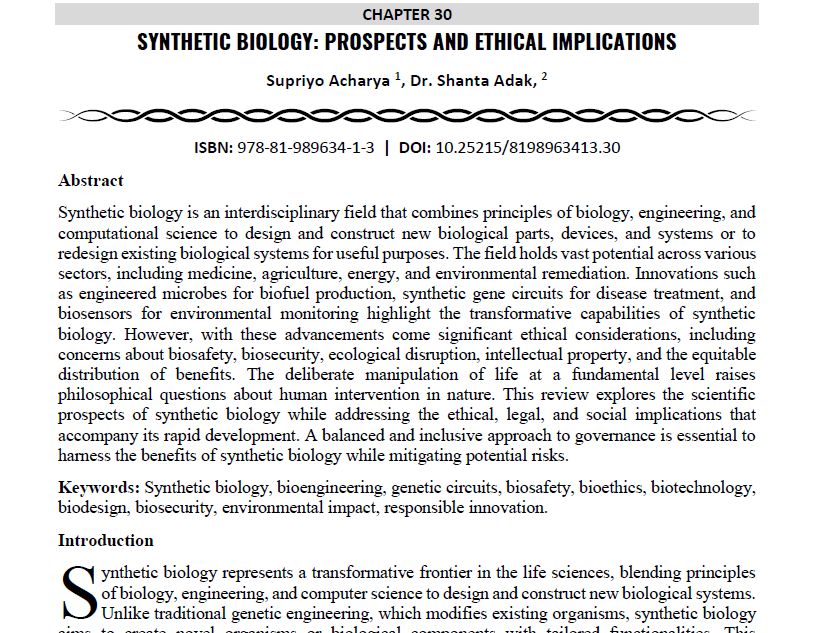 | Aug, 2025 | Global Dimensions of Multidisciplinary Research-02 | Synthetic Biology: Prospects and Ethical Implications. | Innovative Global Publications | 978-81-989634-1-3 | Document |