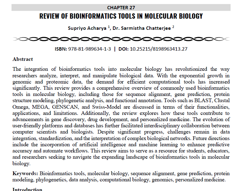 | Aug, 2025 | Global Dimensions of Multidisciplinary Research-03 | Review of Bioinformatics Tools in Molecular Biology. | Innovative Global Publications | 978-81-989634-1-3 | Document |
