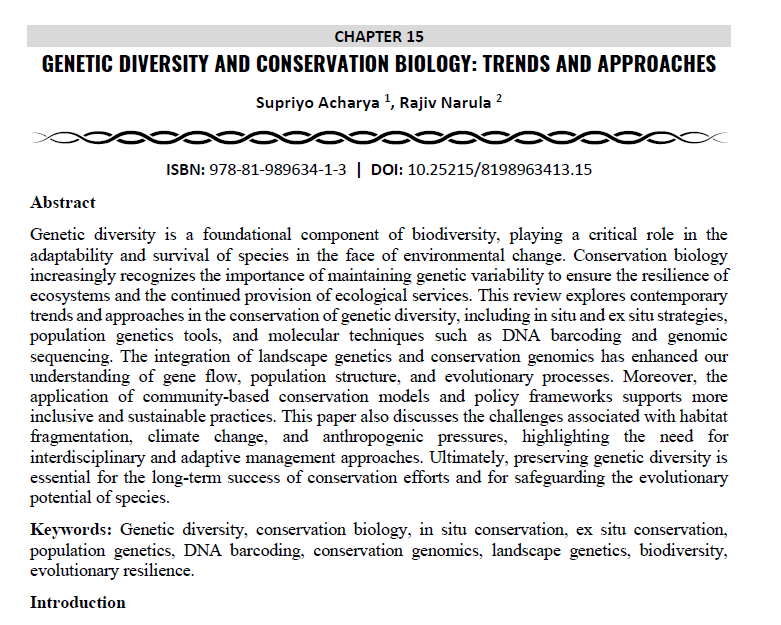 | Aug, 2025 | Global Dimensions of Multidisciplinary Research-04 | Genetic Diversity and Conservation Biology: Trends and Approaches. | Innovative Global Publications | 978-81-989634-1-3 | Document |