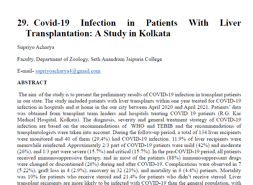 | Jun, 2025 | Ideas in Transition: Multidisciplinary Explorations. | COVID-19 Infection in Patients with Liver Transplantation: A Study in Kolkata | CIRS Publication | 978-81-987955-7-1 | Document |