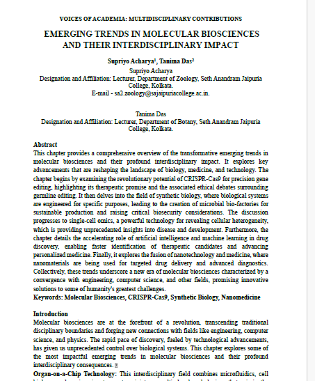 | Jul, 2025 | Voice of Academia: Multidisciplinary Contributions. | Emerging Trends in Molecular Biosciences and Their Interdisciplinary Impact | CIRS Publication | 978-81-991376-2-2 | Document |