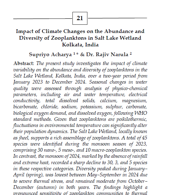 | Aug, 2025 | Integrating Knowledge and Nature: Pathways to Sustainable Development-01 | Impact of Climate Changes on the Abundance and Diversity of Zooplanktons in Salt Lake Wetland Kolkata, India | Princeps Publishing | 978-81-993933-8-7 | Document |