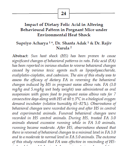 | Aug, 2025 | Integrating Knowledge and Nature: Pathways to Sustainable Development-02 | Impact of Dietary Folic Acid in Altering Behavioral Pattern in Pregnant Mice Under Environmental Heat Shock | Princeps Publishing | 978-81-993933-8-7 | Document |