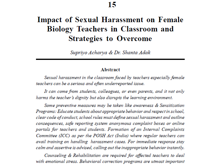 | Nov, 2025 | Voice of India (A Multidisciplinary Anthology) | Impact of Sexual Harassment on Female Biology Teachers in Classroom and Strategies to Overcome | Kunal Books Publication | 978-93-6389-242-2 | Document |
