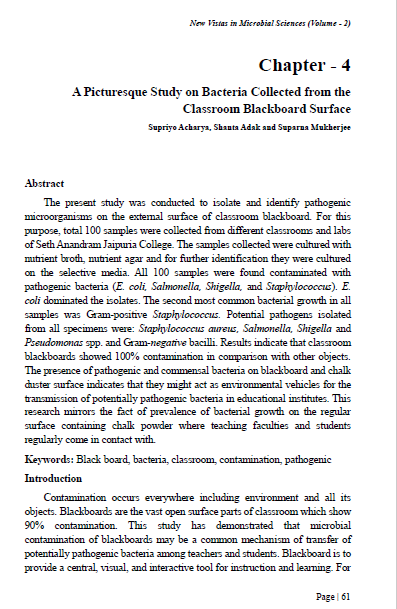| Dec, 2025 | New Vistas in Microbial Sciences | A Picturesque Study on Bacteria Collected from the Classroom Blackboard Surface. | Integrated Publications | 978-93-93502-47-6 | Document |