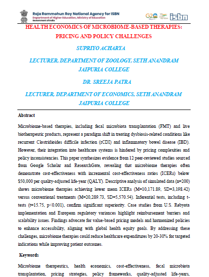 | Oct, 2025 | Innovation Through Integration | Health Economics of Microbiome-Based Therapies: Pricing and Policy Challenges | Henxi Publication | 978-81-987316-0-9 | Document |