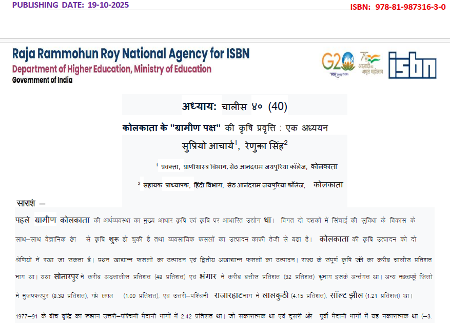 | Aug, 2025 | Integrative Pathways Across Disciplines -01 | कोलकाता की ग्रामीण पक्ष की कृषि प्रवृत्ति: एक अध्ययन | Henxi Publication | 978-81-987316-3-0 | Document |
