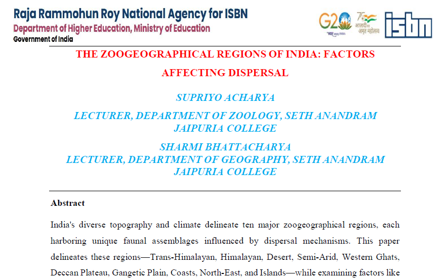 | Aug, 2025 | Integrative Pathways Across Disciplines -02 | The Zoogeographical Regions of India: Factors Affecting Dispersal. | Henxi Publication | 978-81-987316-3-0 | Document |