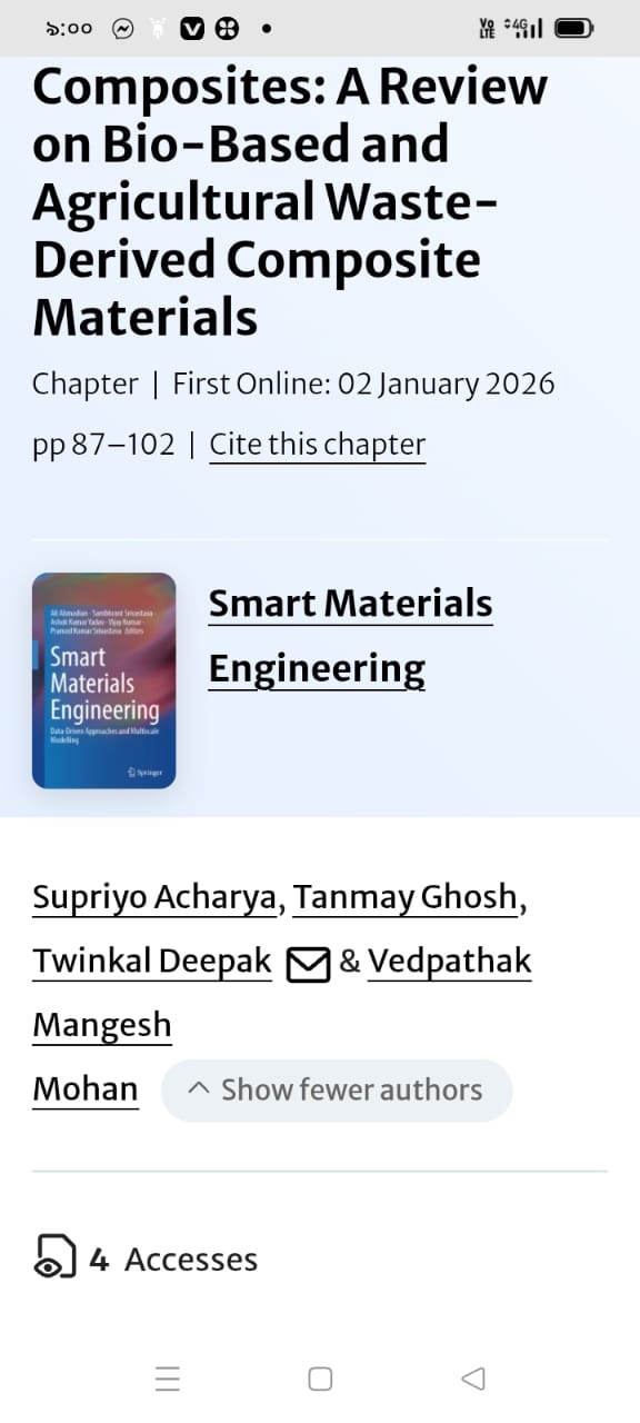 | Jan, 2026 | Smart Materials Engineering | Green Revolution in Composites: A Review on Bio-Based Agricultural Waste-Derived Composite Materials. | SPRINGER NATURE | 978-3-032-09540-4 | Document |