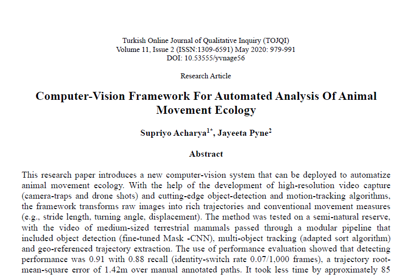 | Nov, 2025 | Computer-Vision Framework for Automated Analysis of Animal Movement Ecology | Turkish Online Journal of Qualitative Inquiry | 11 | Supriyo Acharya and Jayeeta Pyne | 1309-6591 | Scopus | Yes | 2020 | 0.4 | Document | ||