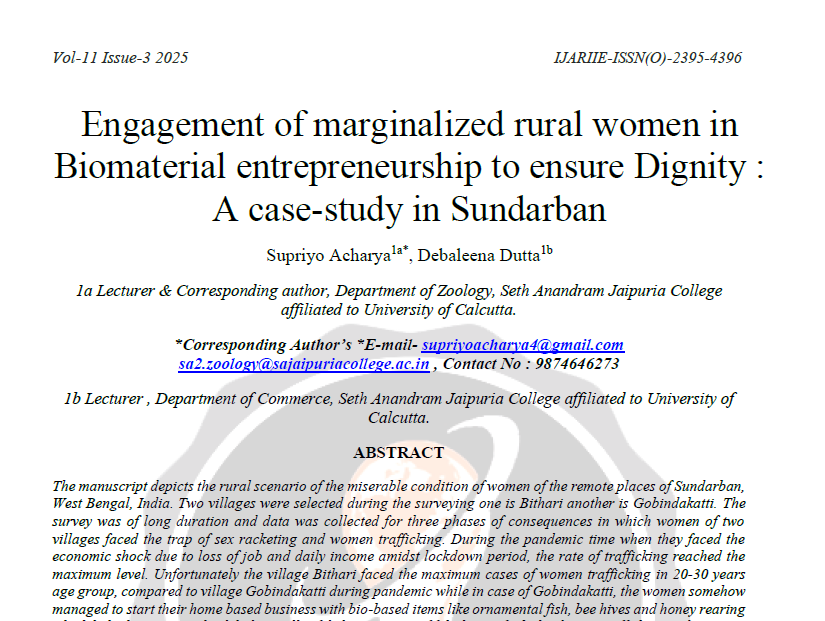 | Apr, 2025 | Engagement of Marginalized Rural Women in Biomaterial Entrepreneurship to Ensure Dignity: A Case-Study in Sundarban | International Journal of Advance Research and Innovative Ideas in Education | 11 | Supriyo Acharya, Debaleena Dutta | 2395-4396 | None | 2022 | Yes | 2022 | 0.9 | Document | |