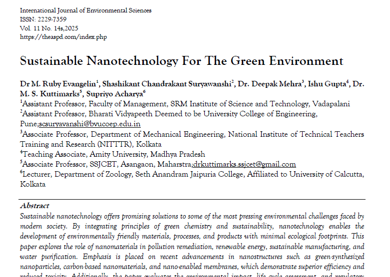 | May, 2025 | Sustainable Nanotechnology for Green Environment | International Journal of Environmental Sciences | 11 | Supriyo Acharya and others | 2229-7359 | None | 2022 | Yes | 2022 | 1.4 | Document | |