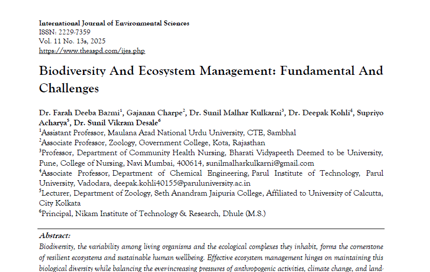 | Jul, 2025 | Biodiversity and Ecosystem Management: Fundamental and Challenges. | International Journal of Environmental Sciences | 11 | Supriyo Acharya and others | 2229-7359 | None | 2022 | Yes | 2022 | 1.4 | Document | |