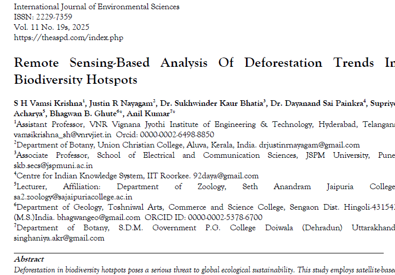 | Jul, 2025 | Remote Sensing Based Analysis of Deforestation Trends in Biodiversity Hotspots. | International Journal of Environmental Sciences | 11 | Supriyo Acharya and others | 2229-7359 | None | 2022 | Yes | 2022 | 1.4 | Document | |