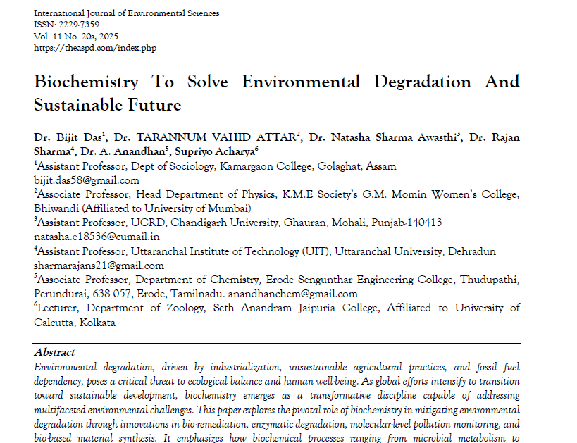 | Jul, 2025 | Biochemistry to Solve Environmental Degradation and Sustainable Future. | International Journal of Environmental Sciences | 11 | Supriyo Acharya and others | 2229-7359 | None | 2022 | Yes | 2022 | 1.4 | Document | |
