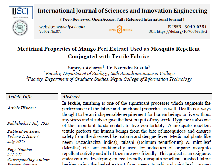 | Aug, 2025 | Medicinal Properties of Mango Peel Extract Used as Mosquito Repellent Conjugated with Textile Fabrics. | International Journal of Science and Innovation Engineering | 02 | Supriyo Acharya and others | 3049-0251 | None | 2025 | Yes | 2022 | 3.54 | Document | |