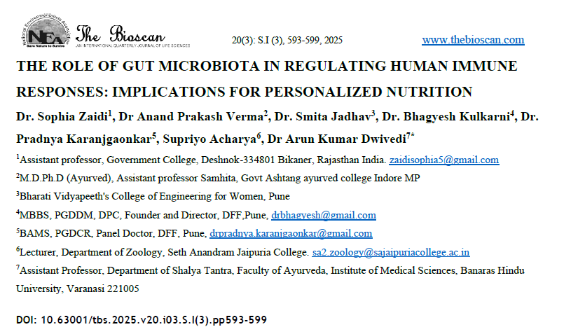 | Aug, 2025 | The Role of Gut Microbiota in Regulating Human Immune Responses: Implications for Personalized Nutrition | The Bioscan Journal | 20 | Supriyo Acharya and others | 0973-7049 | Web of Science | 2025 | Yes | 2022 | 6.856 | Document | |